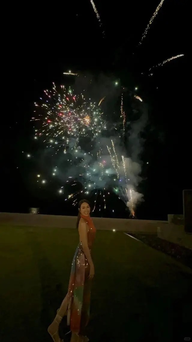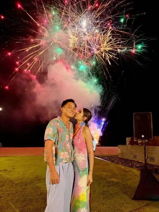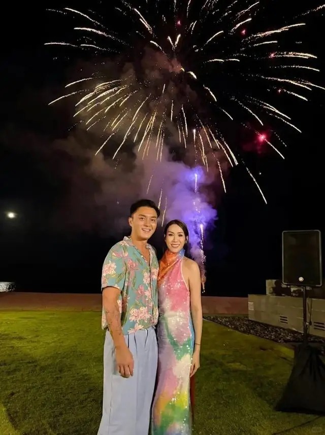 当晚庄思明身着露背长裙,特意转身秀出白皙美背,在烟火背景下向男友连连送吻,画面甜度爆表。杨明站在一旁,笑容满足,两人互动自然,毫无拍拖多年的“老夫老妻”之感。
